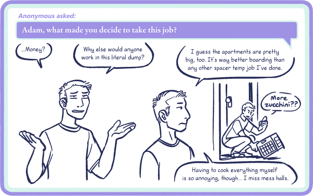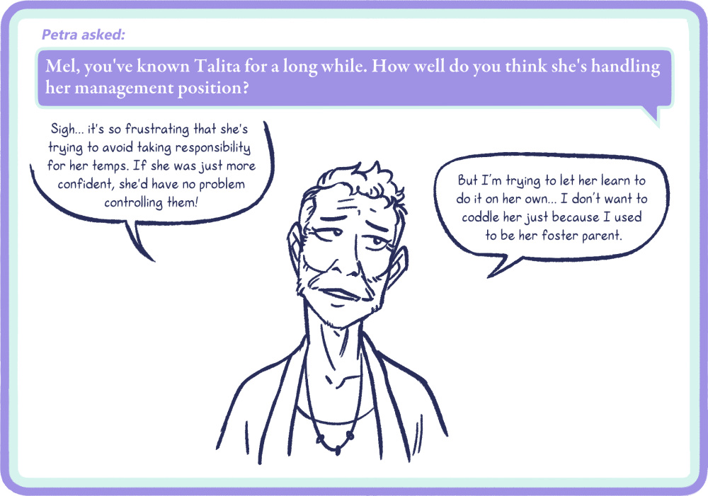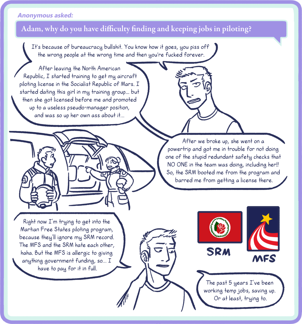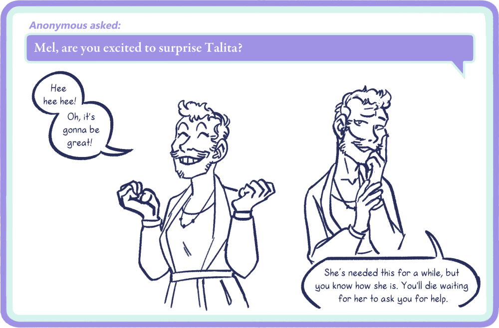 I considered my options and decided I would prefer to have a hiatus than slow down the update schedule for narrative pages, because I feel that 3 updates a week with breaks at the end of chapters makes for a more enjoyable reading experience. This will also allow me do editing how I prefer to, which is reviewing an entire chapter once it is complete. There are two more chapters remaining in this RttS book (the first of a planned four) and they are some of the longest and juiciest chapters in the book, so I need more time to finish them. There will be another hiatus after Chapter 9 finishes posting here. I’m slowing down the rate at which Reader Questions post, because honestly, they eat up time that really ought to be going into finishing the actual book. So, I’ll be back with Chapter 9 on February 17th, 2026, updating three times a week, but Reader Questions will be posting every Tuesday until then.