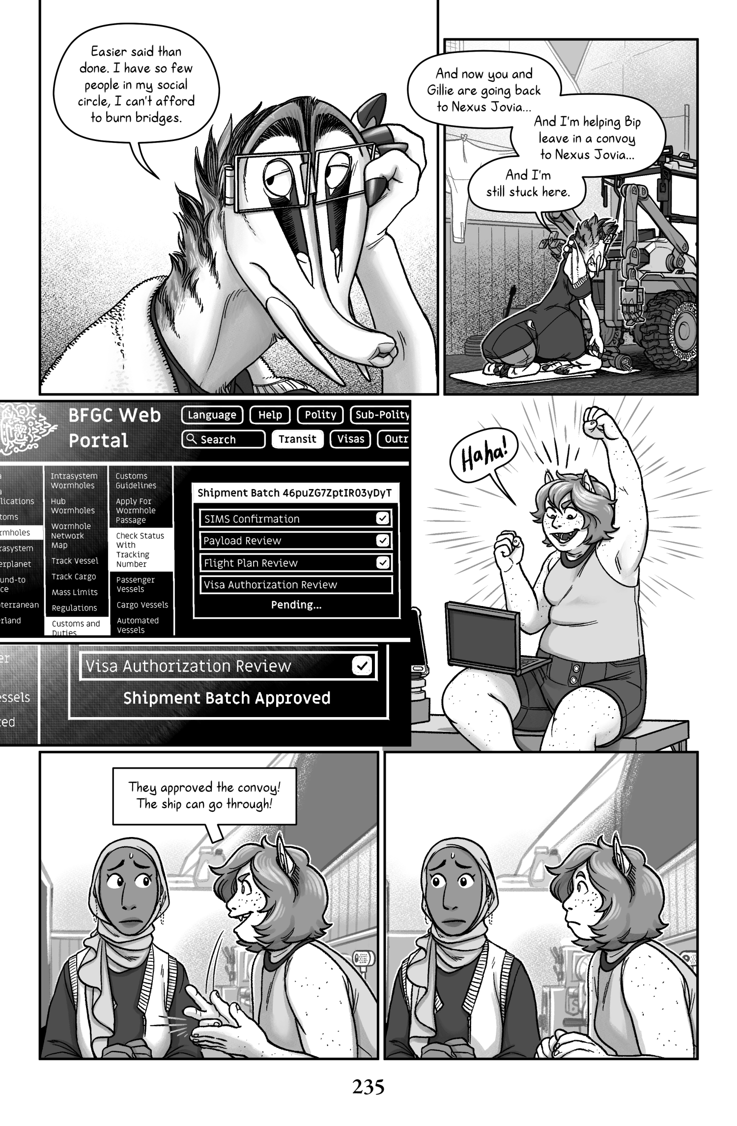 Talita: Easier said than done. I have so few people in my social circle, I can't afford to burn bridges. And now you and Gillie are going back to Nexus Jovia… And I'm helping Bip leave in a convoy to Nexus Jovia... And I'm still stuck here.