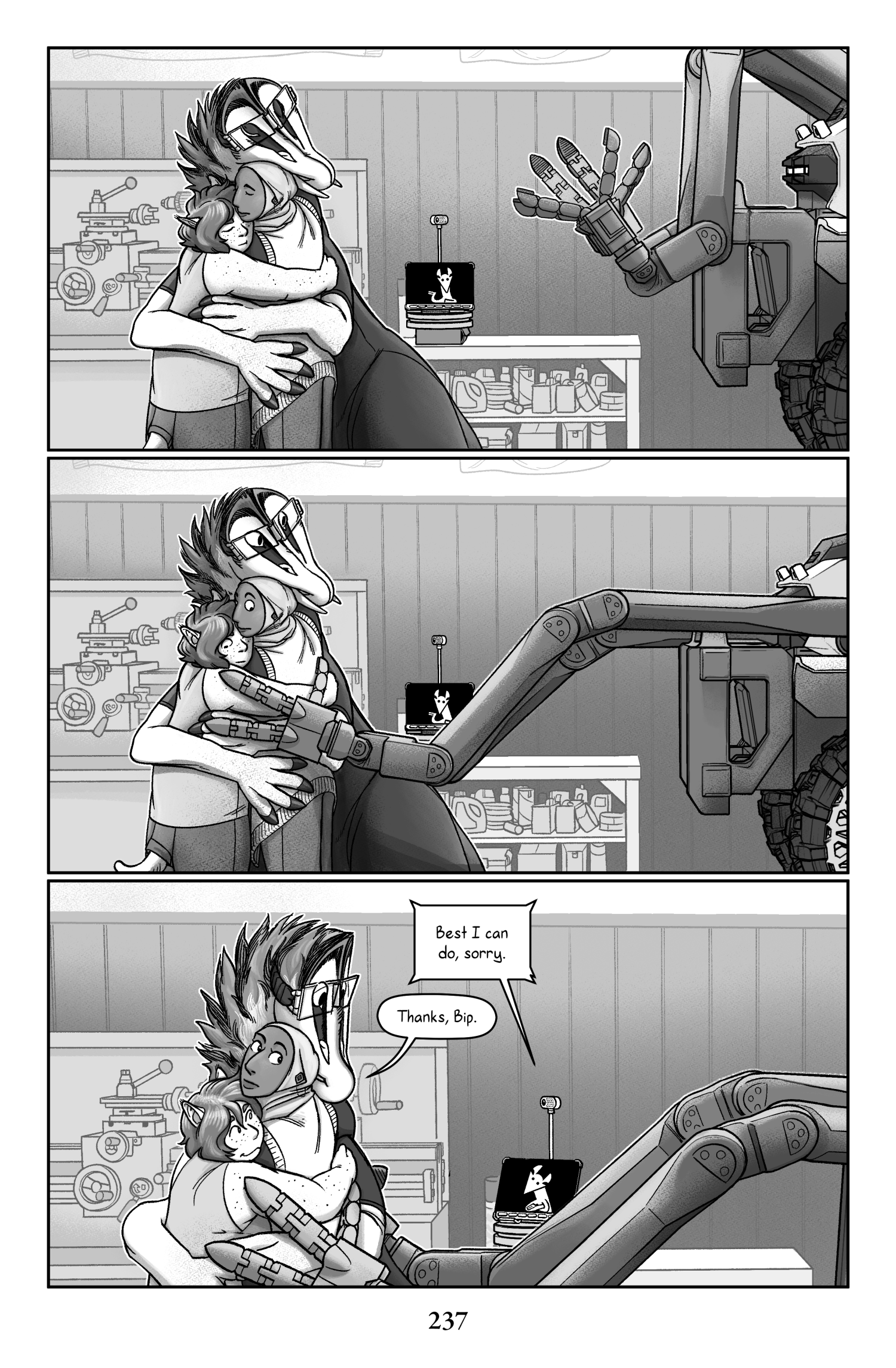 Talita wraps her arms around her friends, rests a cheek on top of Idrisah's head, and relaxes into the hug. Bip turns their webcam towards the the front loader, holding up its newly attached articulated hands. They reach out with them and gingerly grasp the group of women with the metal manipulators, who look down in surprise.