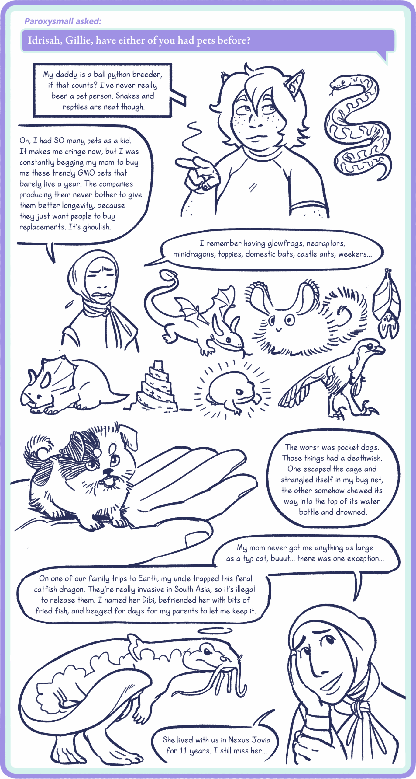 Idrisah: Oh, I had SO many pets as a kid. It makes me cringe now, but I was constantly begging my mom to buy me these trendy GMO pets that barely live a year. The companies producing them never bother to give them better longevity, because they just want people to buy replacements. It's ghoulish. I remember having glowfrogs, neoraptors, minidragons, toppies, domestic bats, castle ants, weekers... The worst was pocket dogs. Those things had a deathwish. One escaped the cage and strangled itself in my bug net, the other somehow chewed its way into the top of its water bottle and drowned. My mom never got me anything as large as a typ cat, buuut... there was one exception... On one of our family trips to Earth, my uncle trapped this feral catfish dragon. They're really invasive in South Asia, so it's illegal to release them. I named her Dibi, befriended her with bits of fried fish, and begged for days for my parents to let me keep it. She lived with us in Nexus Jovia for 11 years. I still miss her...