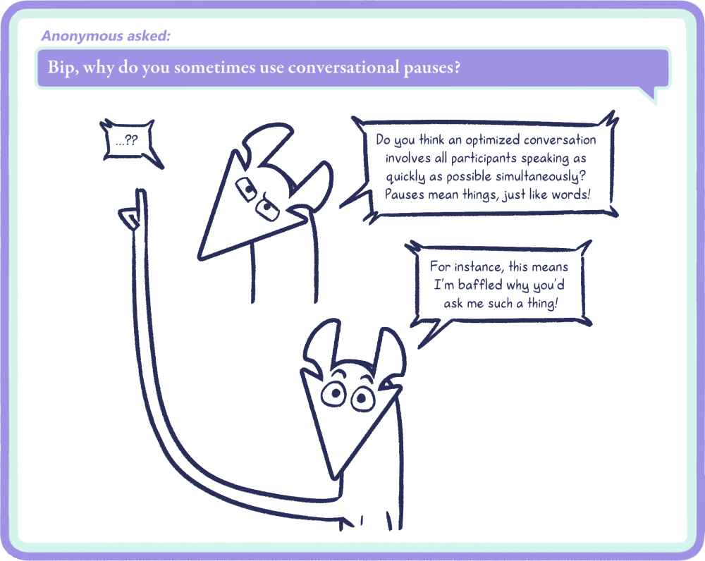 Bip: …?? Do you think an optimized conversation involves all participants speaking as quickly as possible simultaneously? Pauses mean things, just like words! For instance, this means I’m baffled why you’d ask me such a thing!