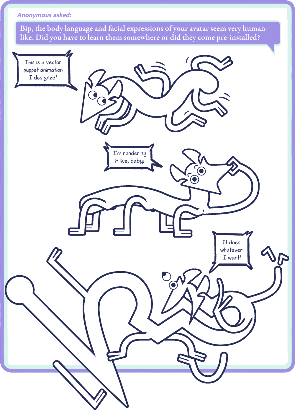 Bip: This is a vector puppet animation I designed! I’m rendering it live, baby! It does whatever I want!
