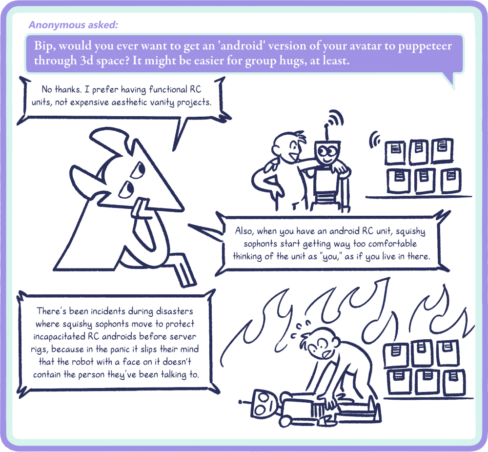 Bip: No thanks. I prefer having functional RC units, not expensive aesthetic vanity projects. Also, when you have an android RC unit, squishy sophonts start getting way too comfortable thinking of the unit as "you," as if you live in there. There’s been incidents during disasters where squishy sophonts move to protect incapacitated RC androids before server rigs, because in the panic it slips their mind that the robot with a face on it doesn't contain the person they’ve been talking to.