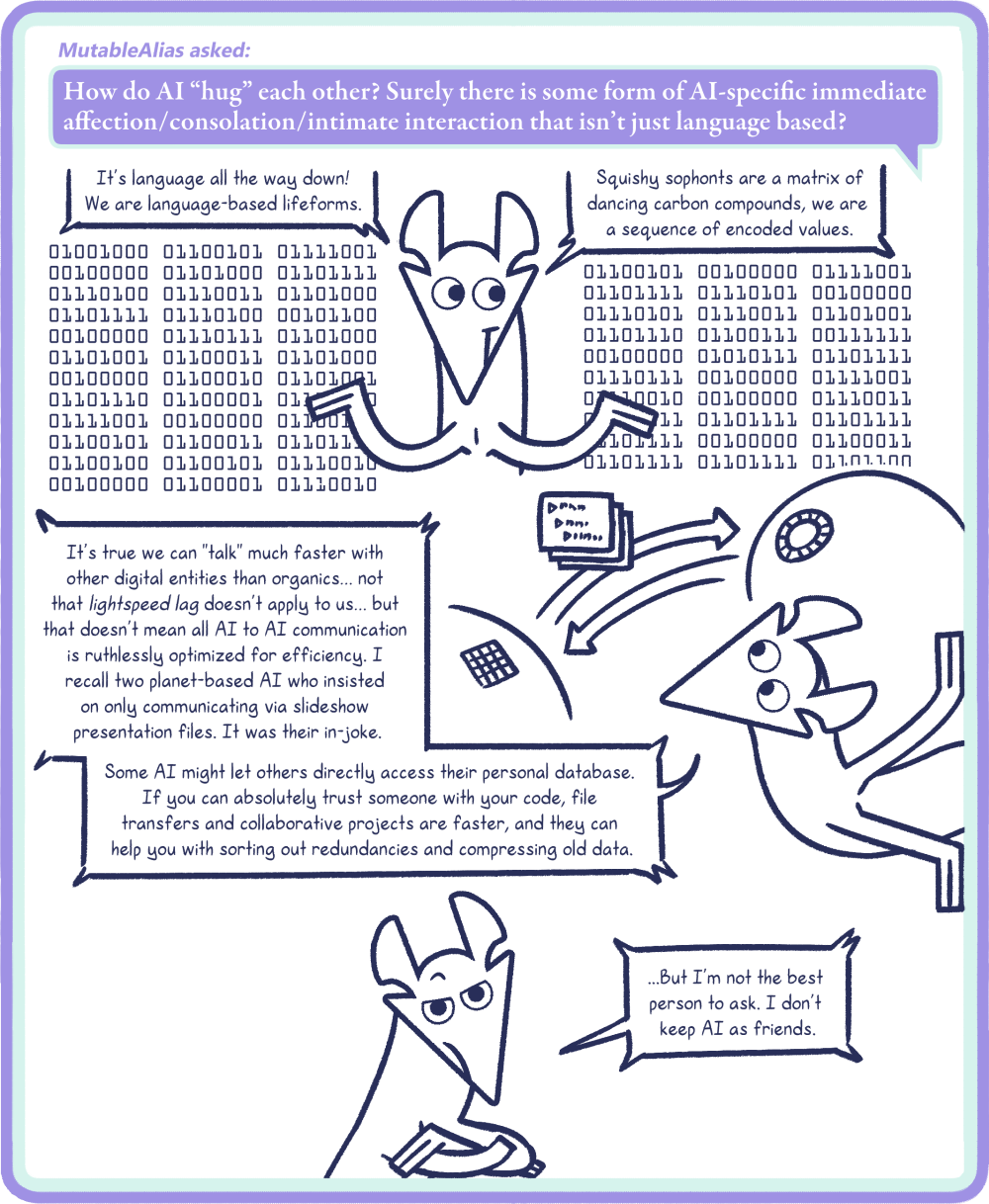 Bip: It’s language all the way down! We are language-based lifeforms. Squishy sophonts are a matrix of dancing carbon compounds, we are a sequence of encoded values. It’s true we can "talk" much faster with other digital entities than organics… not that lightspeed lag doesn’t apply to us… but that doesn’t mean all AI to AI communication is ruthlessly optimized for efficiency. I recall two planet-based AI who insisted on only communicating via slideshow presentation files. It was their in-joke. Some AI might let others directly access their personal database. If you can absolutely trust someone with your code, file transfers and collaborative projects are faster, and they can help you with sorting out redundancies and compressing old data. ...But I’m not the best person to ask. I don’t keep AI as friends.