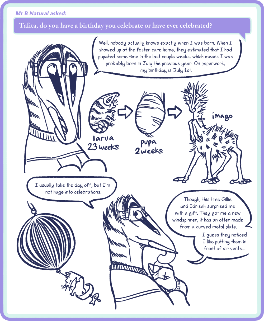 Talita: Well, nobody actually knows exactly when I was born. When I showed up at the foster care home, they estimated that I had pupated some time in the last couple weeks, which means I was probably born in July the previous year. On paperwork, my birthday is July 1st.