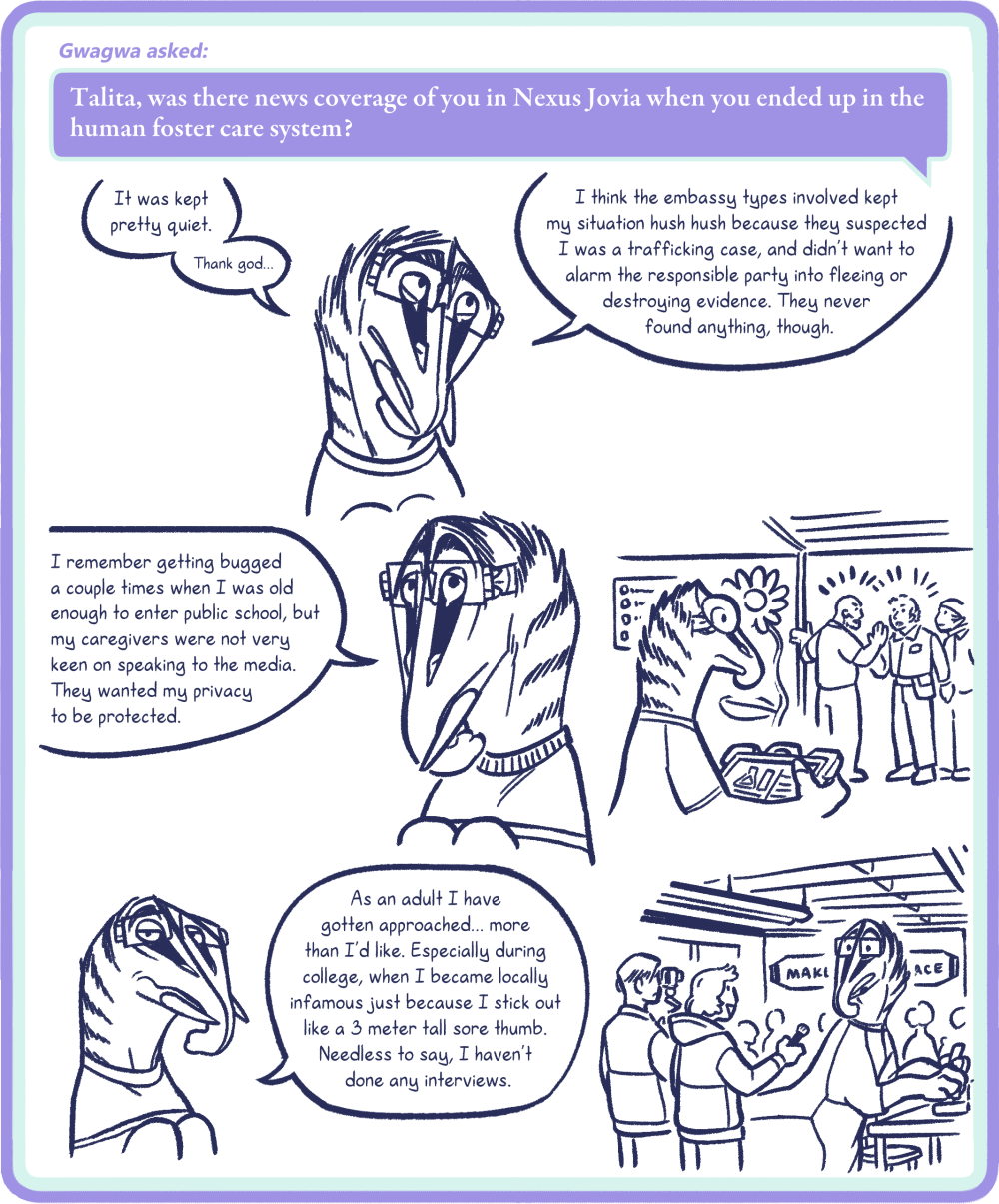 Gwagwa asked: Talita, was there news coverage of you in Nexus Jovia when you ended up in the human foster care system?