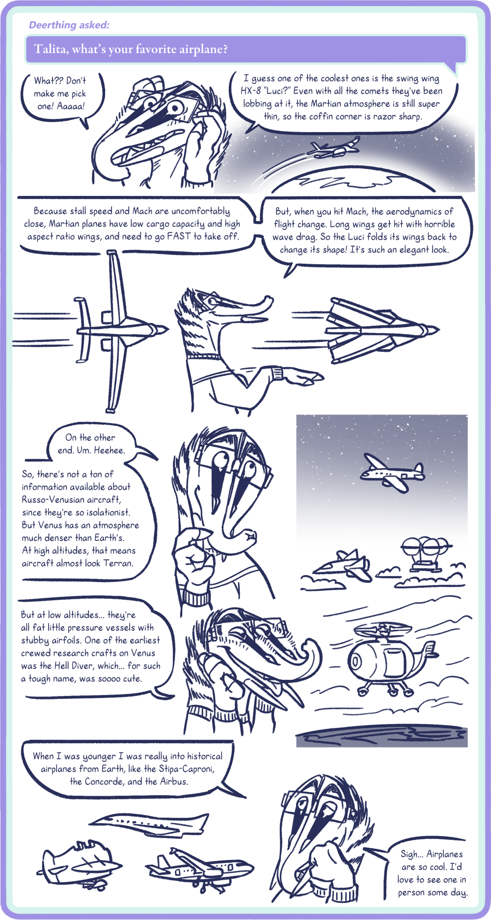 Talita: What?? Don't make me pick one! Aaaaa! I guess one of the coolest ones is the swing wing HX-8 "Luci?" Even with all the comets they've been lobbing at it, the Martian atmosphere is still super thin, so the coffin corner is razor sharp. Because stall speed and Mach are uncomfortably close, Martian planes have low cargo capacity and high aspect ratio wings, and need to go FAST to take off. But, when you hit Mach, the aerodynamics of flight change. Long wings get hit with horrible wave drag. So the Luci folds its wings back to change its shape! It's such an elegant look. On the other end. Um. Heehee. So, there's not a ton of information available about Russo-Venusian aircraft, since they're so isolationist. But Venus has an atmosphere double the density of Earth's. In high altitudes, that means aircraft almost look Terran. But at low altitudes... they're all fat little pressure vessels with stubby wings. One of the earliest manned research crafts on Venus was the Hell Diver, which... for such a tough name, was soooo cute. When I was younger I was really into historical airplanes from Earth, like the Stipa-Caproni, the Concorde, and the Airbus. Sigh... Airplanes are so cool. I'd love to see one in person some day.
