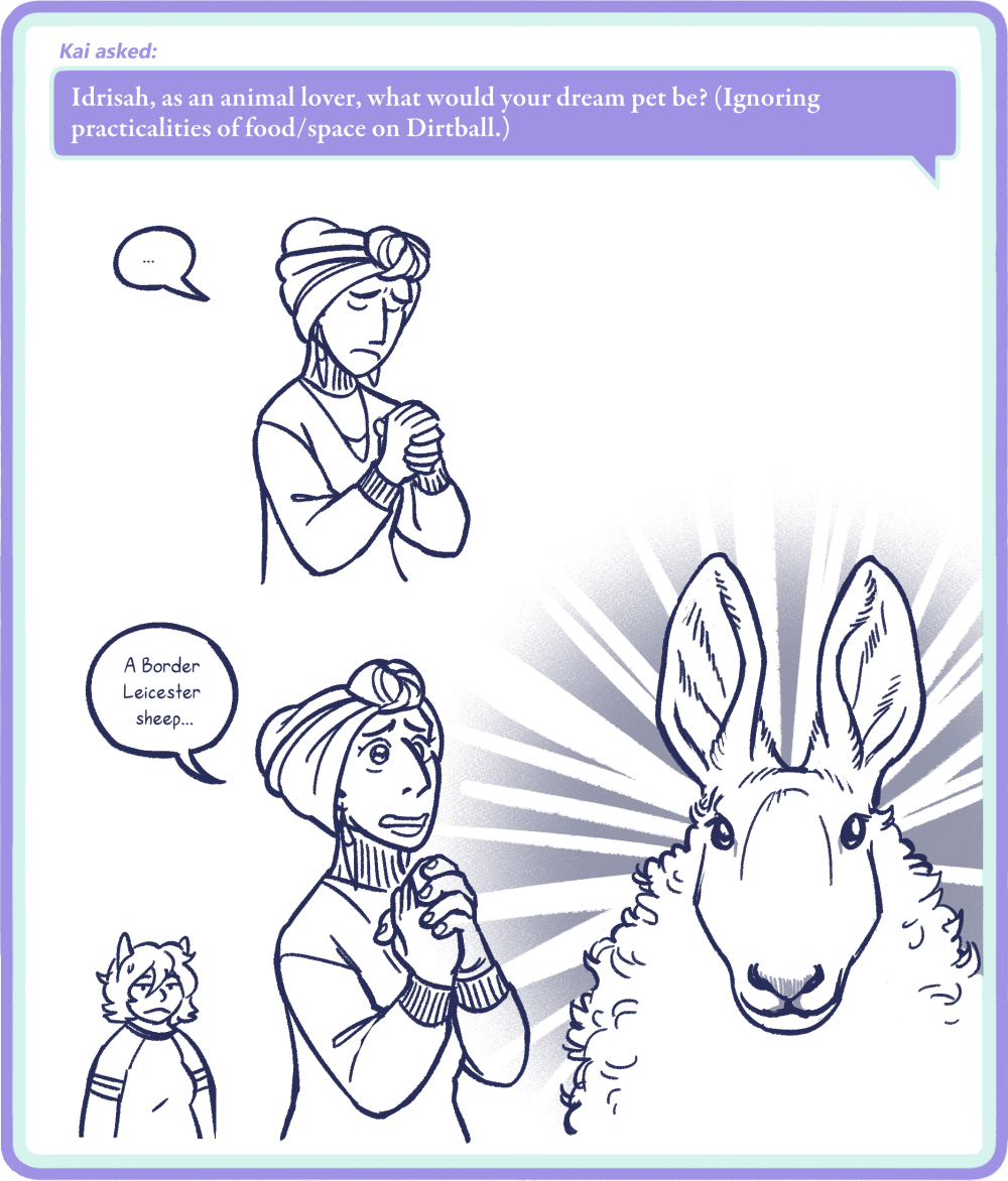 Kai asked: Idrisah, as an animal lover, what would your dream pet be? (Ignoring practicalities of food/space on Dirtball.)