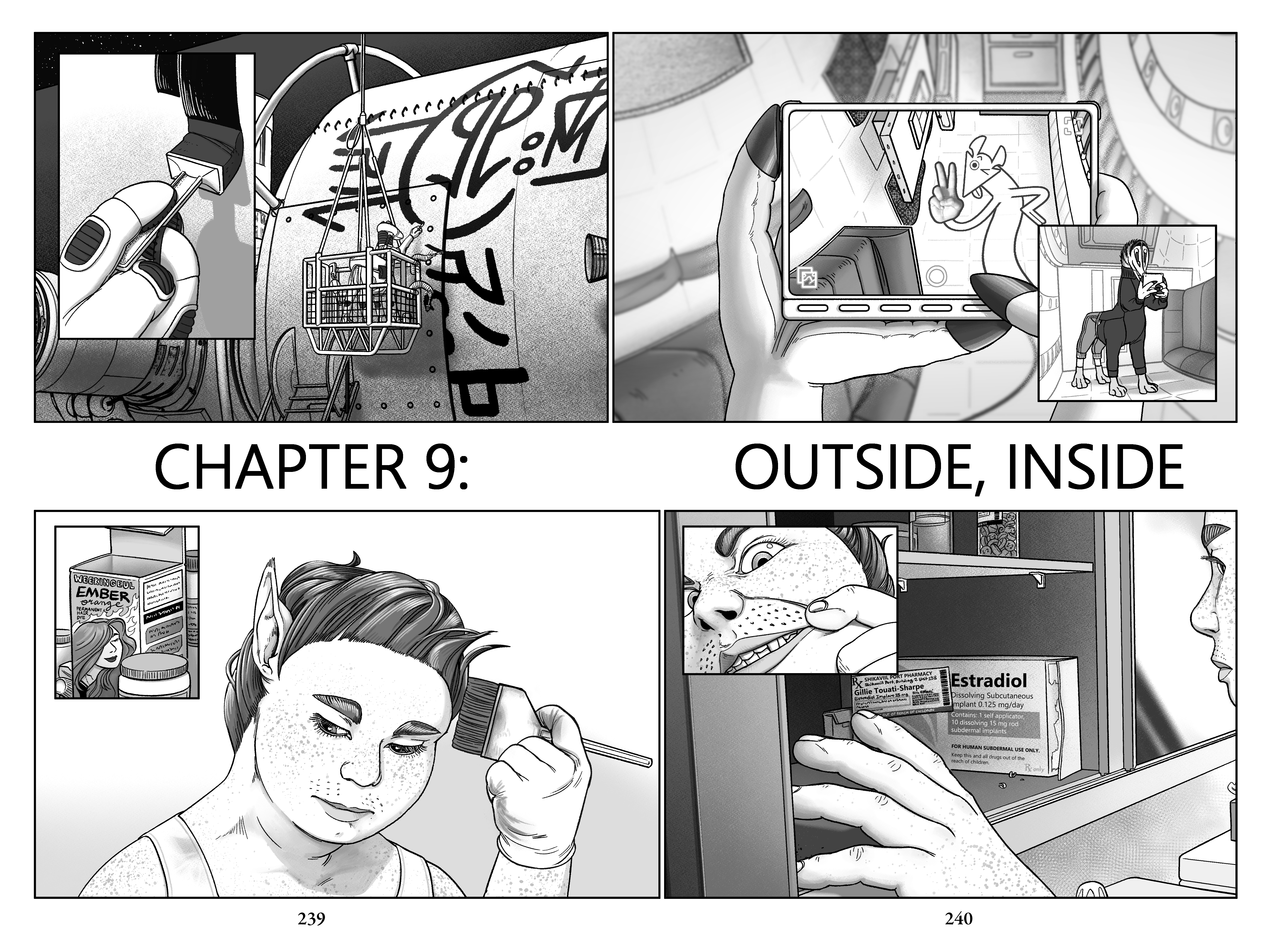 Finishing application, she notices with sneering annoyance that her mystacial whiskers are growing back in. She opens the rather barren medicine cabinet looking for a tool to deal with them, but the only thing on the shelf is an open medicine box for her prescription of Estradiol—Dissolving Subcutaneous Implants, 0.125 mg/day, "for human use only."